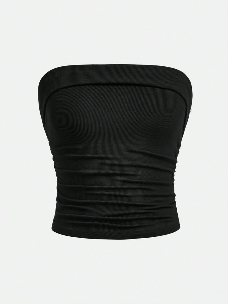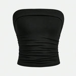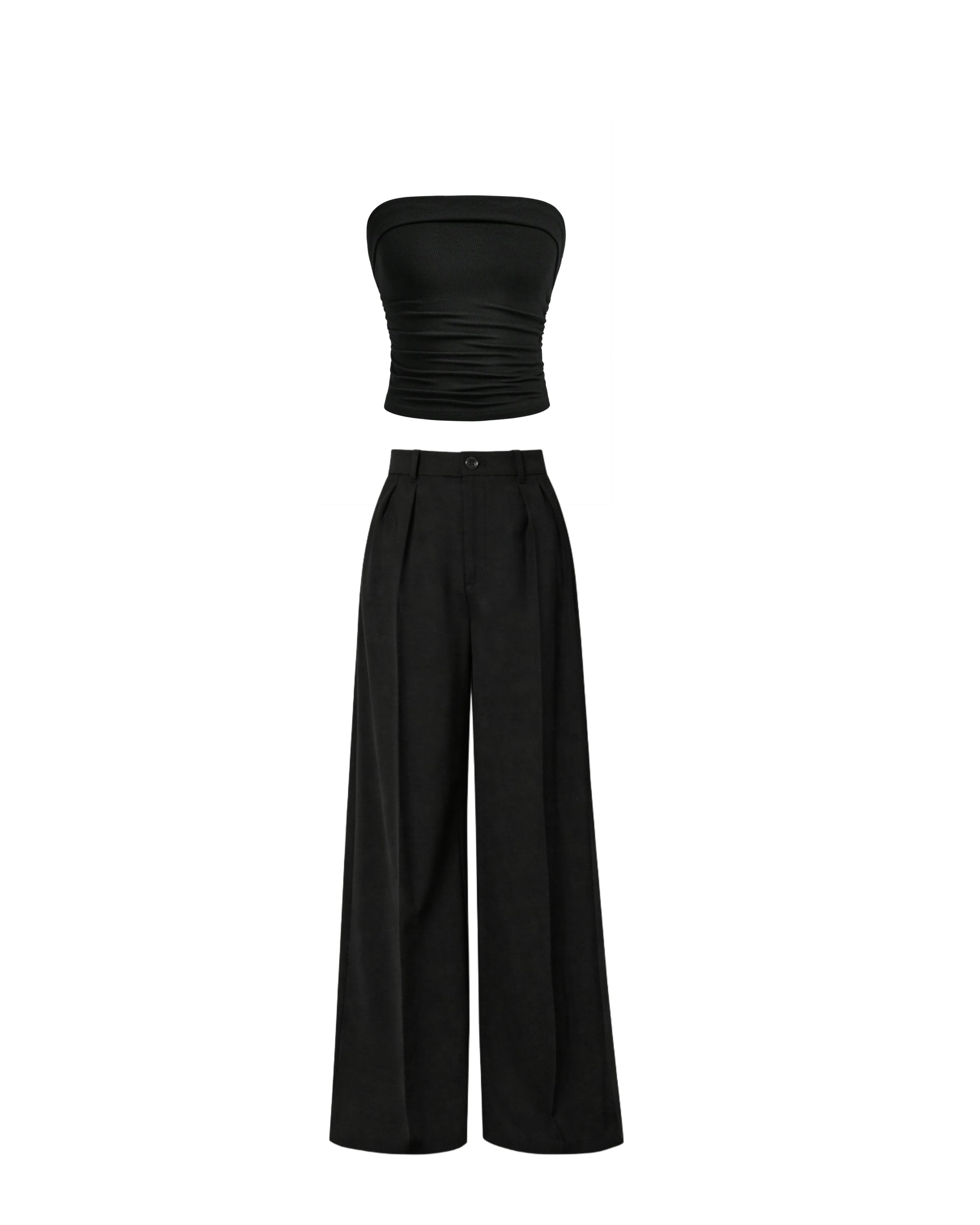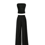 Elevate your everyday style with this sleek black co-ord set featuring a strapless tube top paired with high-waist wide-leg trousers. The tube top comes with a flattering ribbed texture that offers a snug yet comfortable fit, while the trousers add an elegant flow with their structured silhouette.
