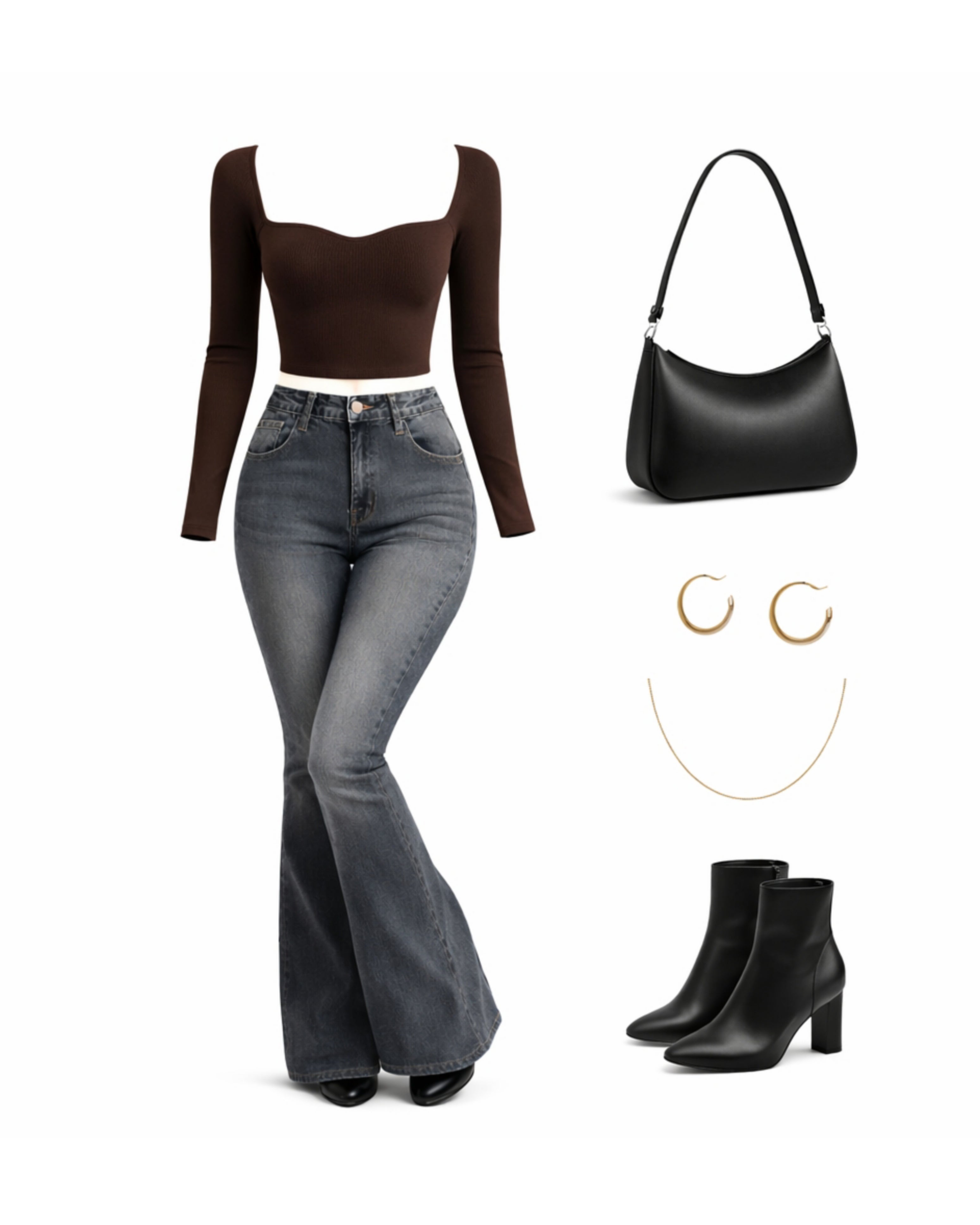Elevate your everyday style with this chic outfit featuring a fitted sweetheart neck crop top paired with flattering bootcut denim jeans. Designed for a sleek and confident look, this outfit is perfect for casual outings, brunch dates, and everyday fashion.