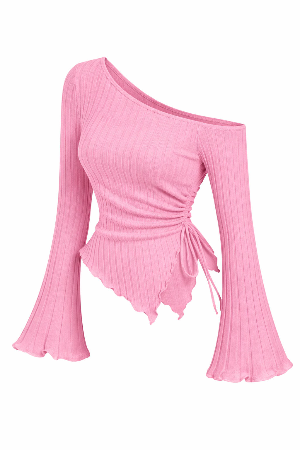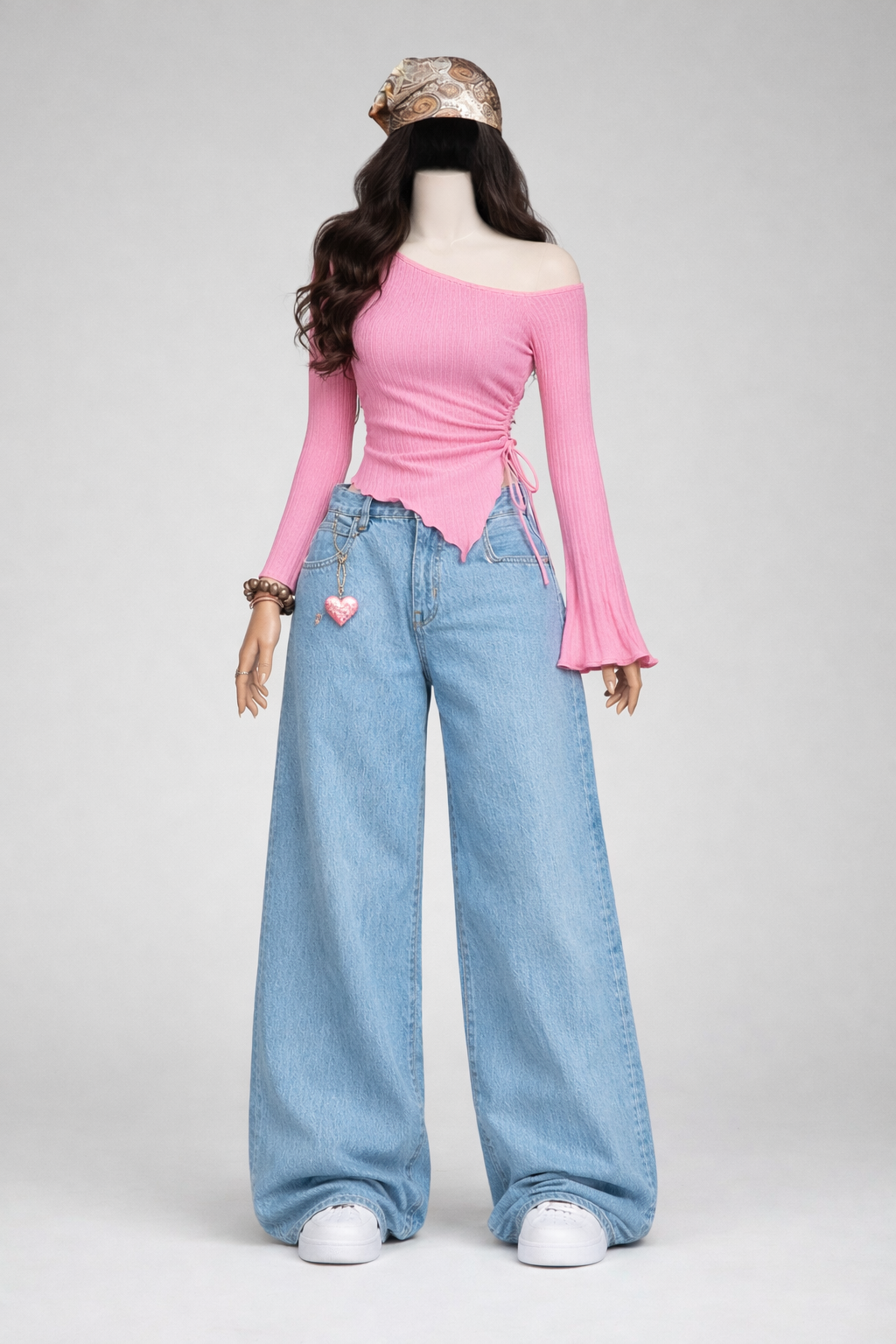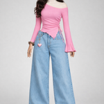 Upgrade your everyday style with this trendy yet classy combo. The pink one-shoulder top features a flattering ruched side detail and flowy bell sleeves that add a feminine touch, while the sky blue baggy jeans bring a relaxed, modern street-style vibe. Perfect for casual outings, college looks, or day hangouts, this outfit balances comfort with effortless fashion.