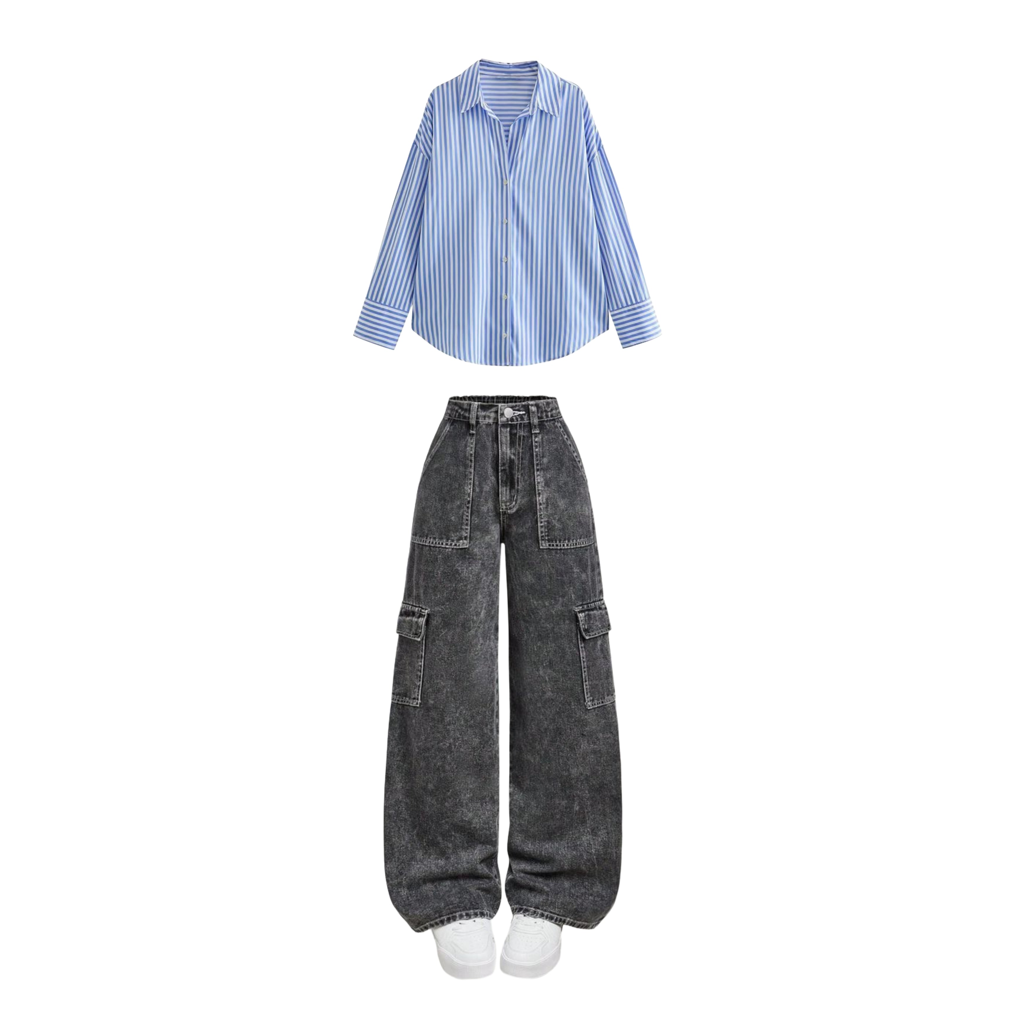 Charcoal High waist cargo jeans | Blue striped shirt ( women )