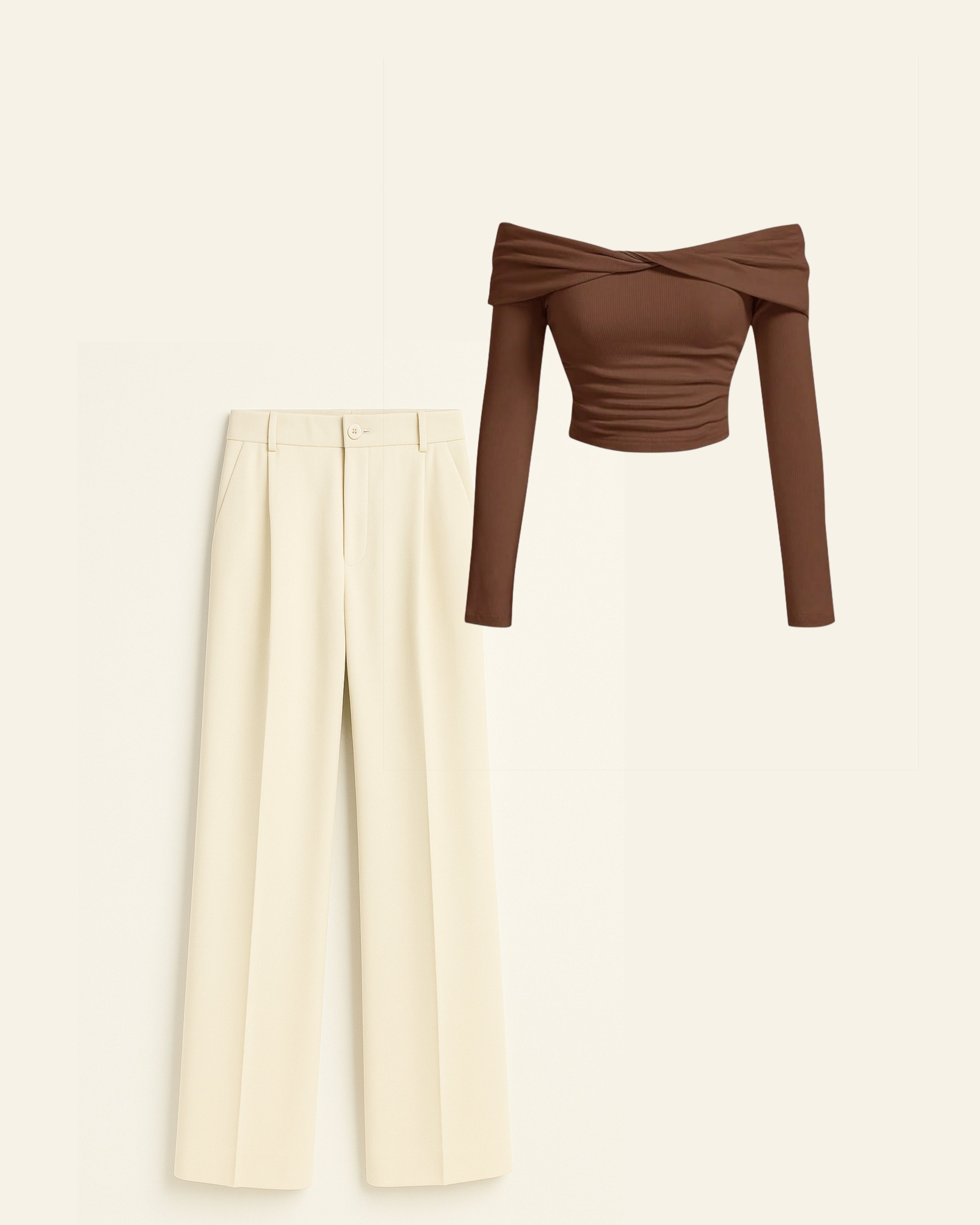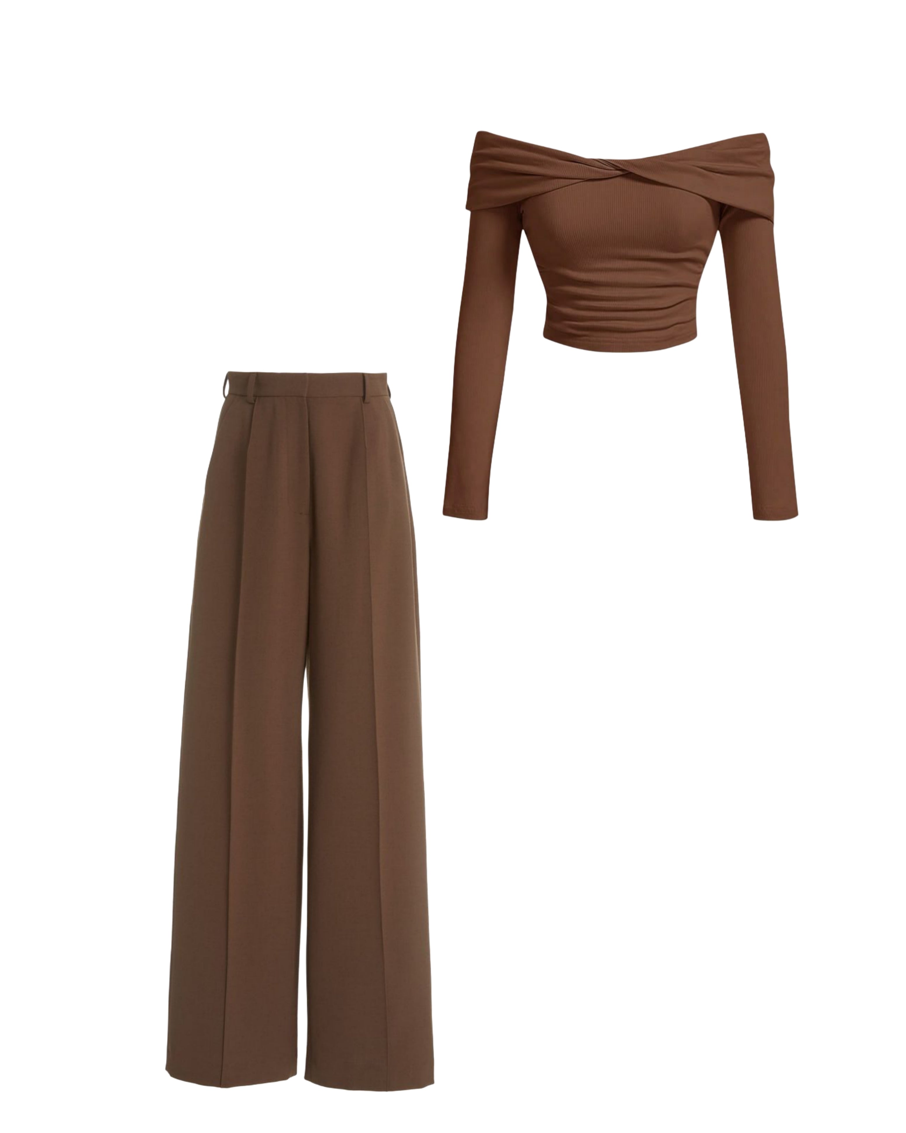 Twist-Detail Brown Top Co-Ord Set with Wide-Leg Trousers