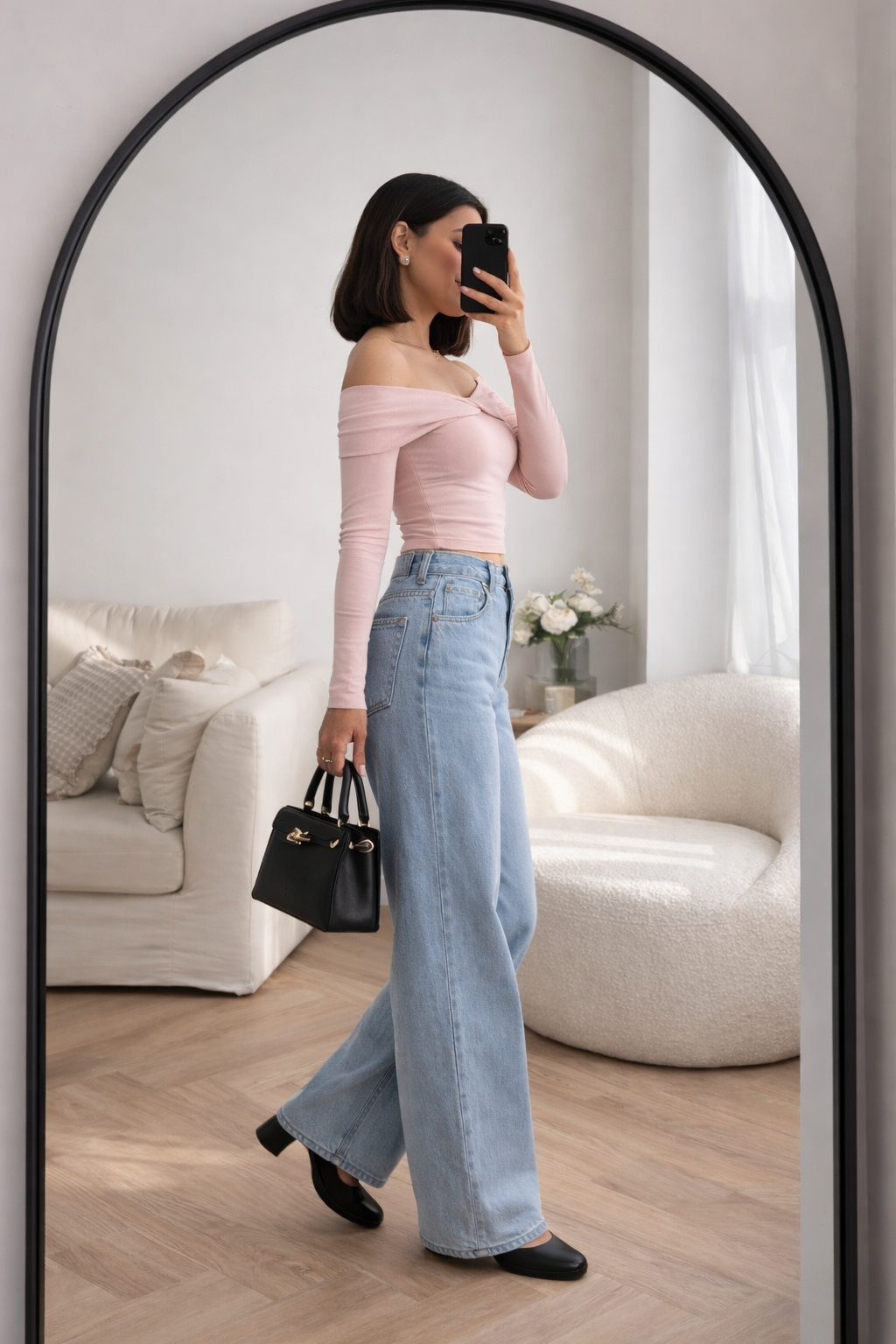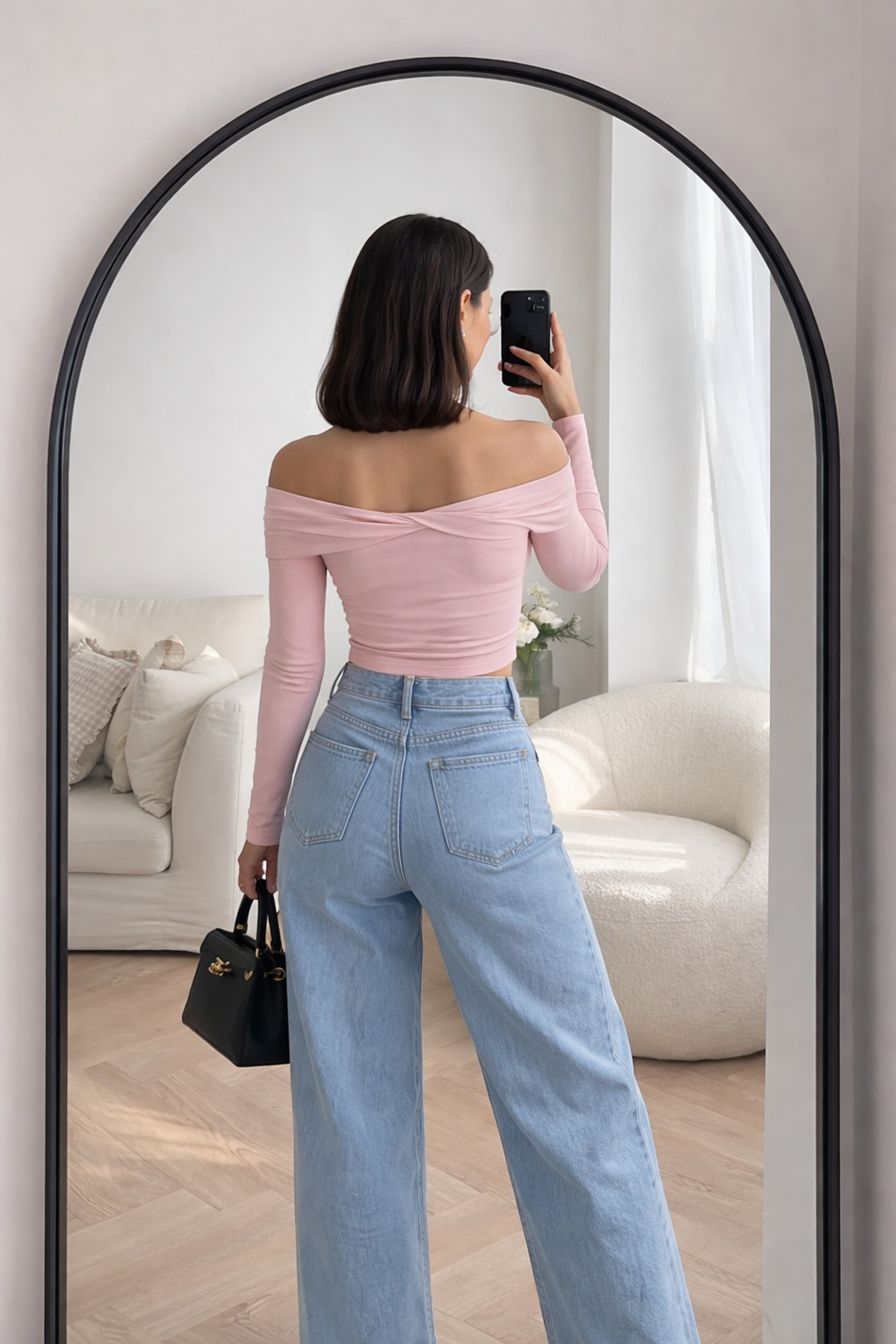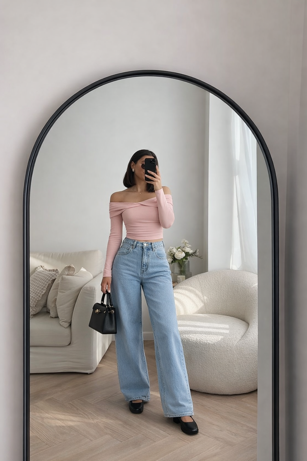 Paired with sky blue baggy denim jeans, the outfit balances structure and ease beautifully. The relaxed fit denim adds a modern yet timeless touch, making the look confident, minimal, and versatile.