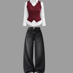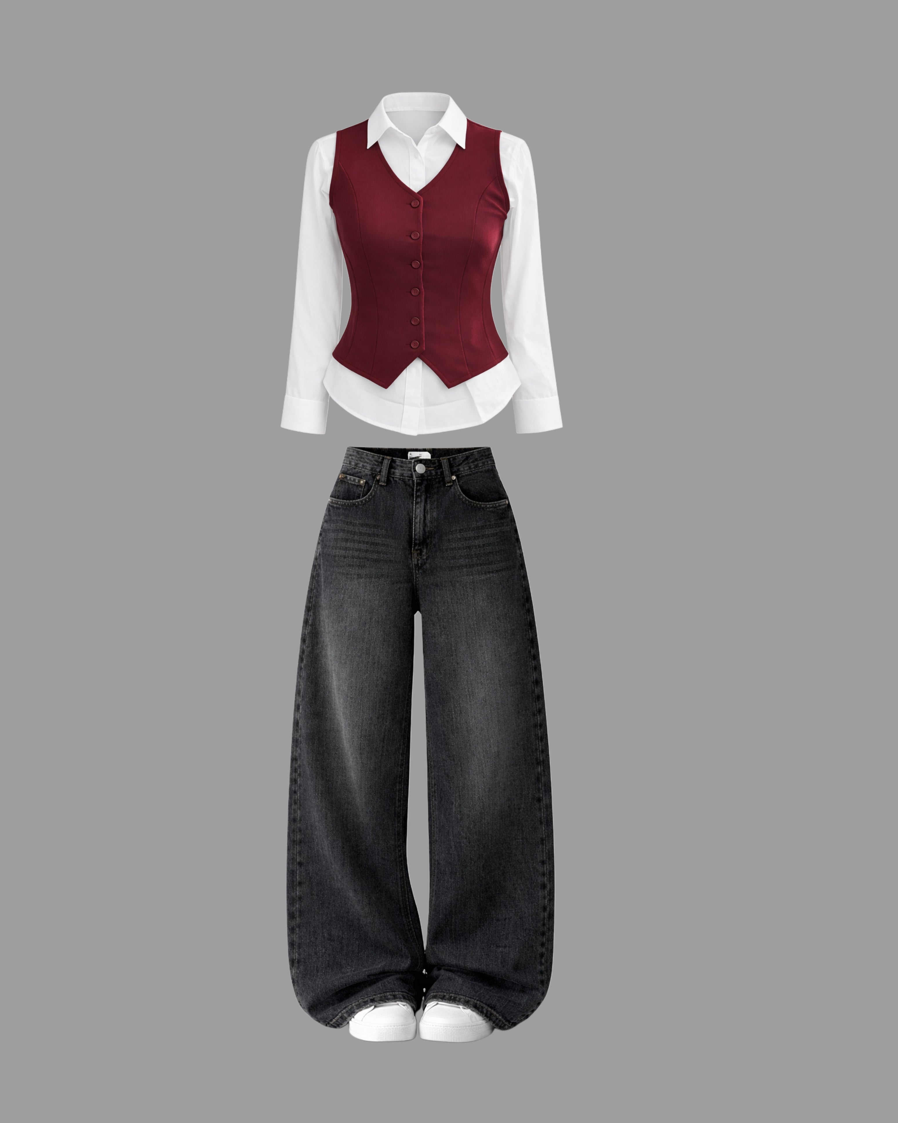 Classic Waistcoat Shirt & Wide-Leg Denim Co-Ord Set | Wine