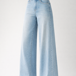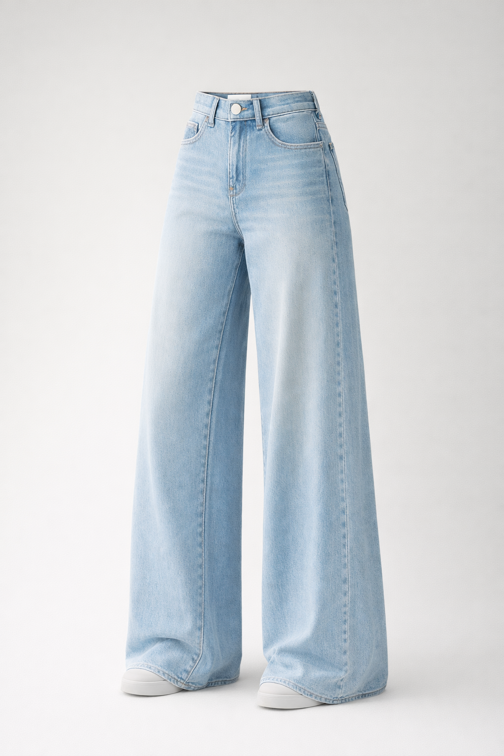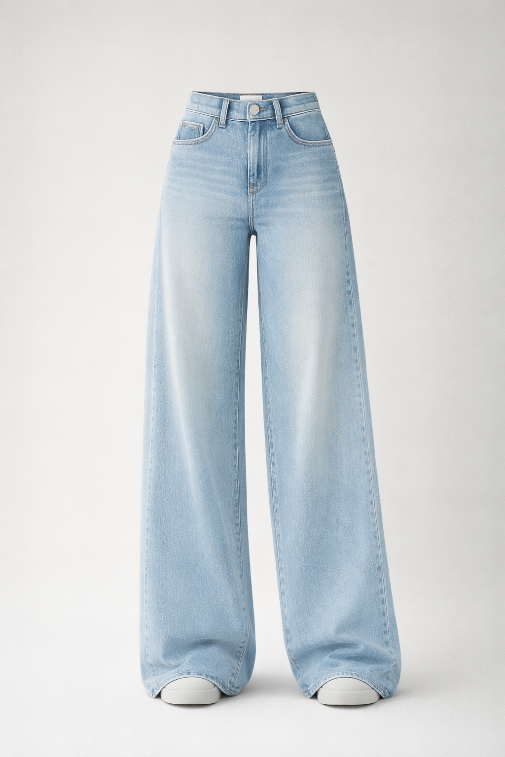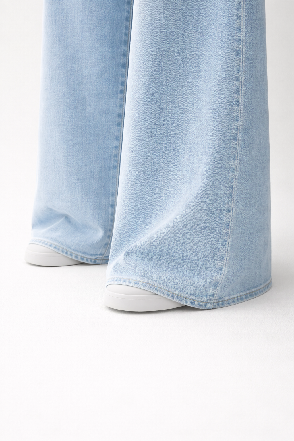 These light blue wide-leg denim jeans are crafted from premium cotton stretch fabric, offering the perfect balance of comfort, structure, and durability. The high-waist fit creates a clean, flattering silhouette, while the wide straight-leg fall adds an effortless, refined look.