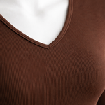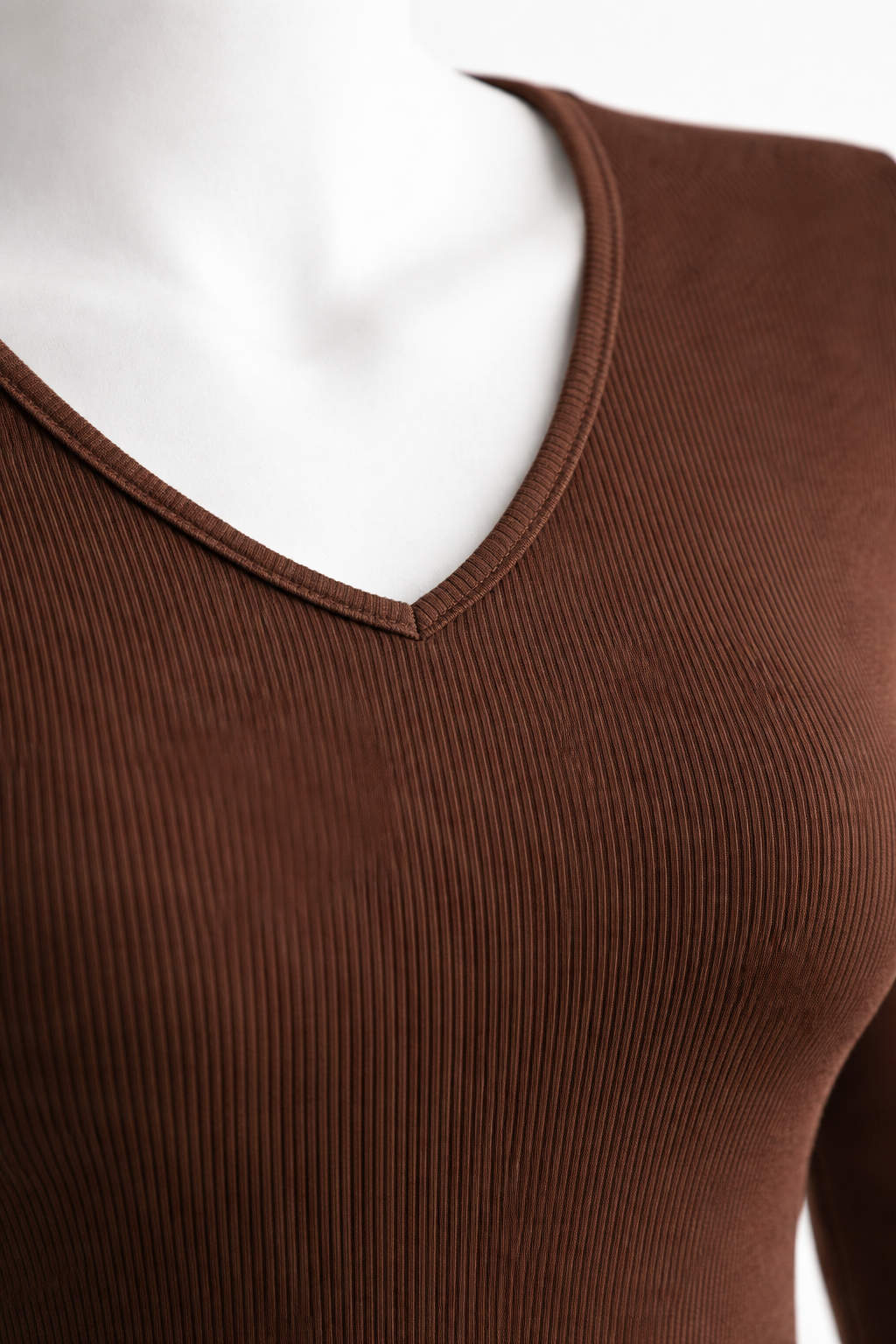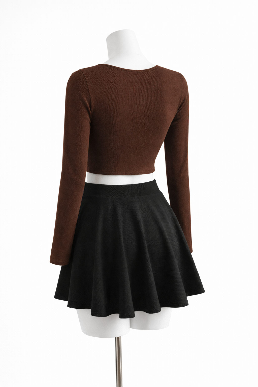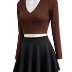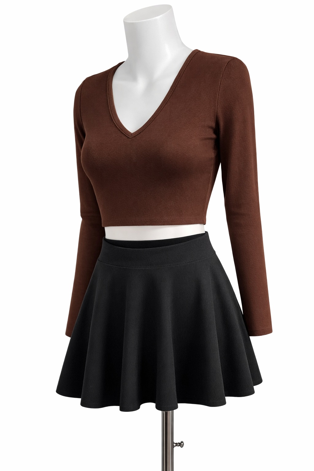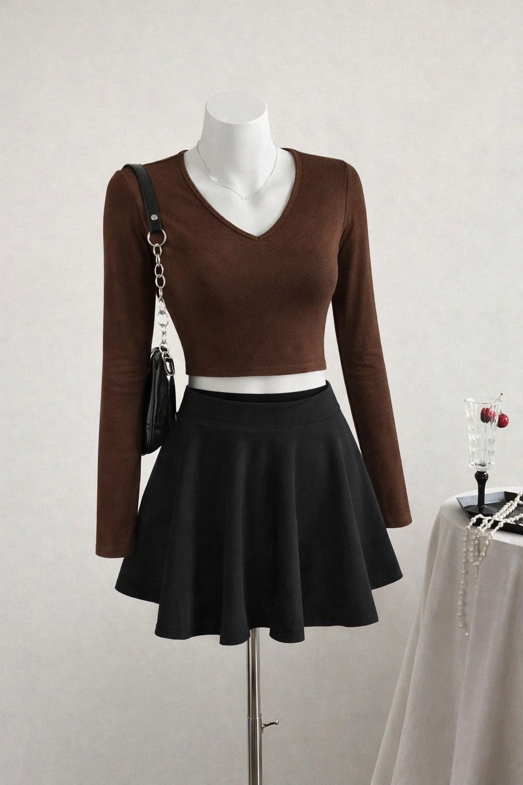 The combination of a fitted V-neck top and a flowing skirt makes this outfit perfect for casual outings, coffee dates, or creating a confident everyday look with a touch of elegance.